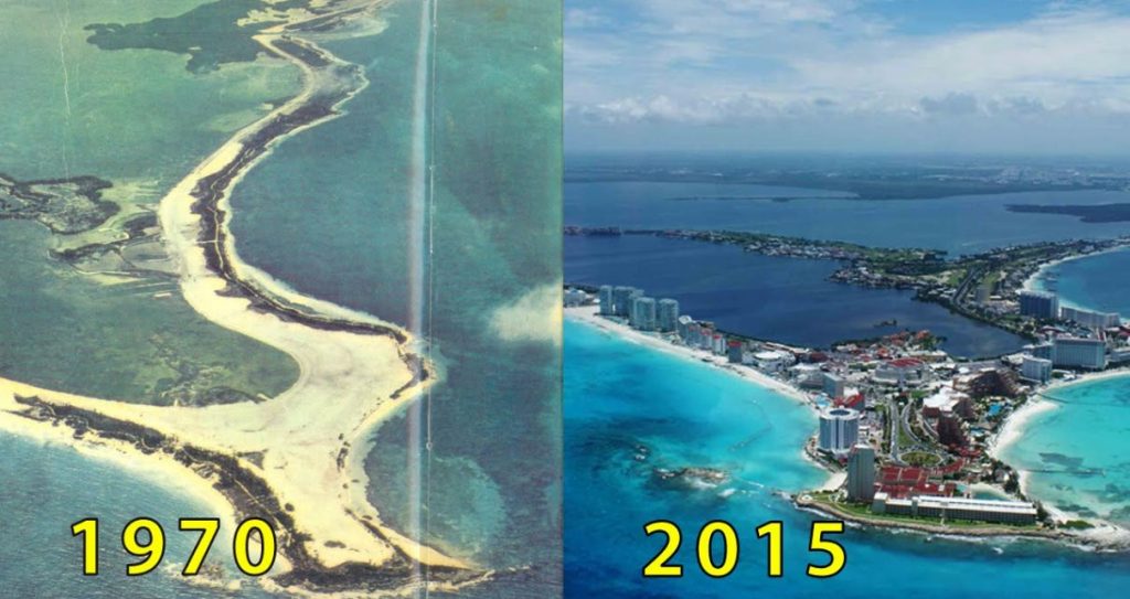Let’s rewind a bit to the late 1960s when the Mexican authorities decided to create Cancun literally from scratch. It was meant to be a counterbalance to the resort town of Acapulco, which at the time primarily attracted wealthy domestic tourists from Mexico City. Acapulco, situated on the Atlantic coast of the state of Guerrero, was accessible within a 5-hour drive. So why, in 1969, did President Diaz Ordaz sign off on the creation of the country’s future tourist hub, situated 28 hours away from Mexico City? The answer is simple: thanks to the rise of air travel in the 1970s and the exponential growth of the northeastern United States. It made more sense for the Mexican authorities to urbanize a completely new area to cater to the very specific needs of the North American market rather than saturating Mexico’s only major resort town with foreign tourists. It’s worth noting that American tourists have always preferred to maintain their consumption habits when they travel. Thus, Cancun was born in 1970 with the aim of attracting the weary workforce from the cold winters of the northern United States. Cities like New York, Washington, Boston, Detroit, Chicago, Pittsburgh, and Philadelphia are all within a 4-hour flight of Cancun. A successful recipe was concocted, transforming a narrow strip of sand, only 20 meters wide but more than 30 kilometers long, to accommodate some of the world’s largest hotels: the famous “resorts.” They all offered comfort and were situated on sandy beaches facing the turquoise sea. A winning combination.